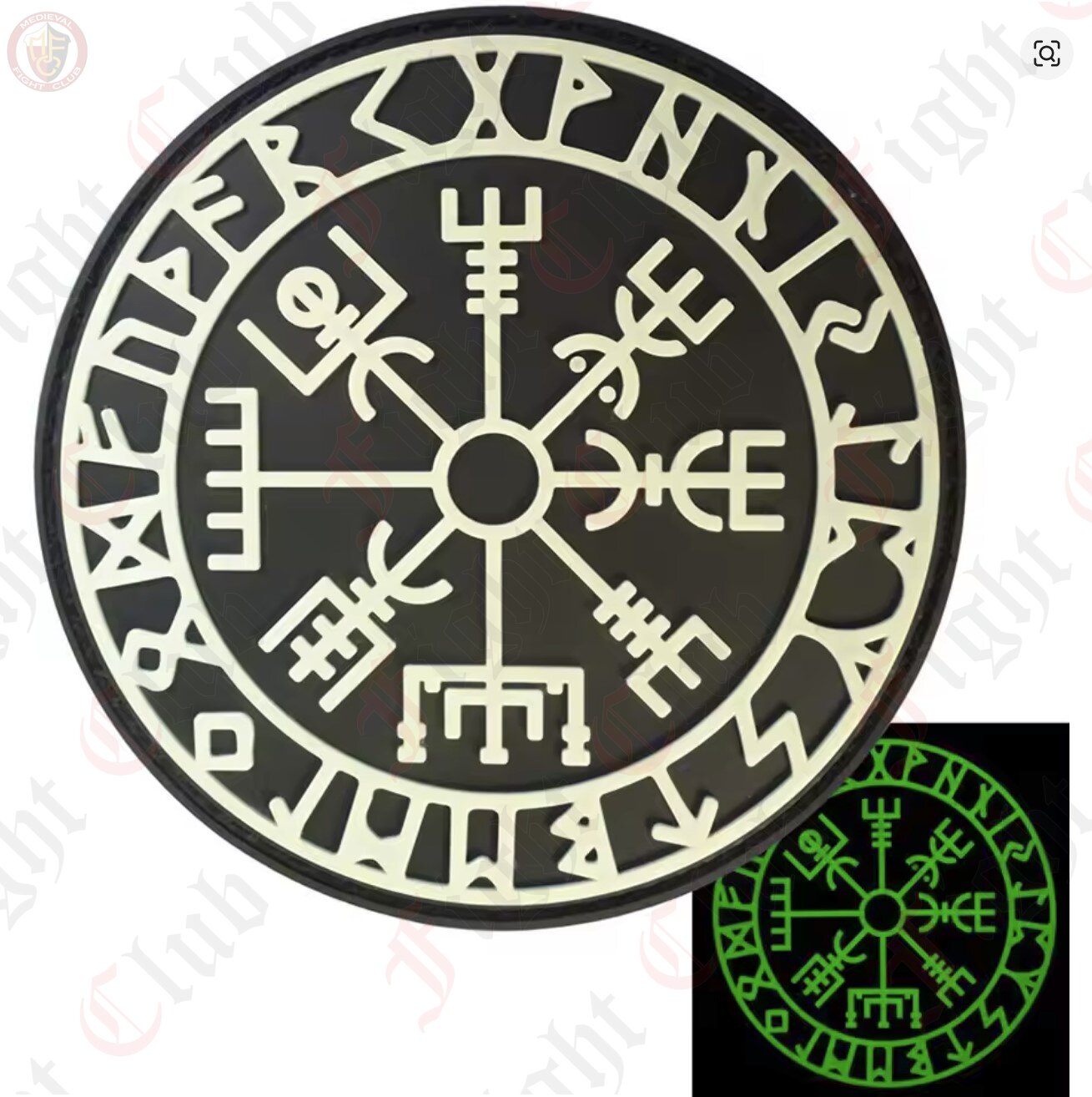 A Viking style patch. This patch is in the shape of a the Vegvisir in a white glow in the dark with a black background.