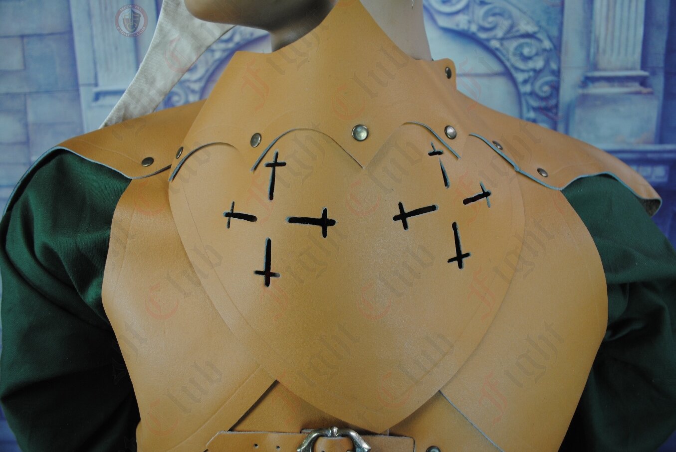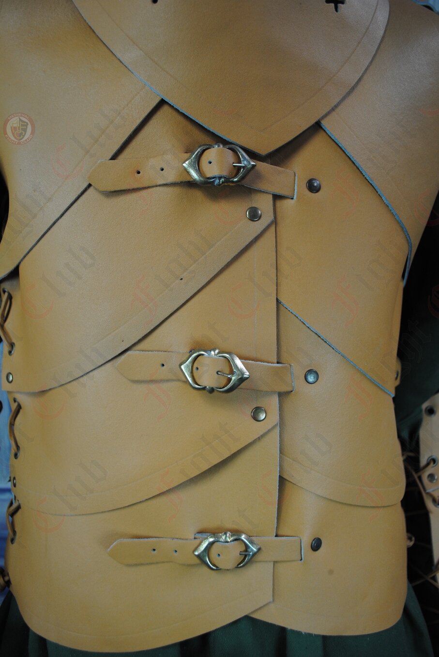 The breastplate is made from individual leather pieces that are laced down both sides of the torso. Each piece is also riveted to the one below and strong sturdy brass buckles ensure it is easy to get on and off.