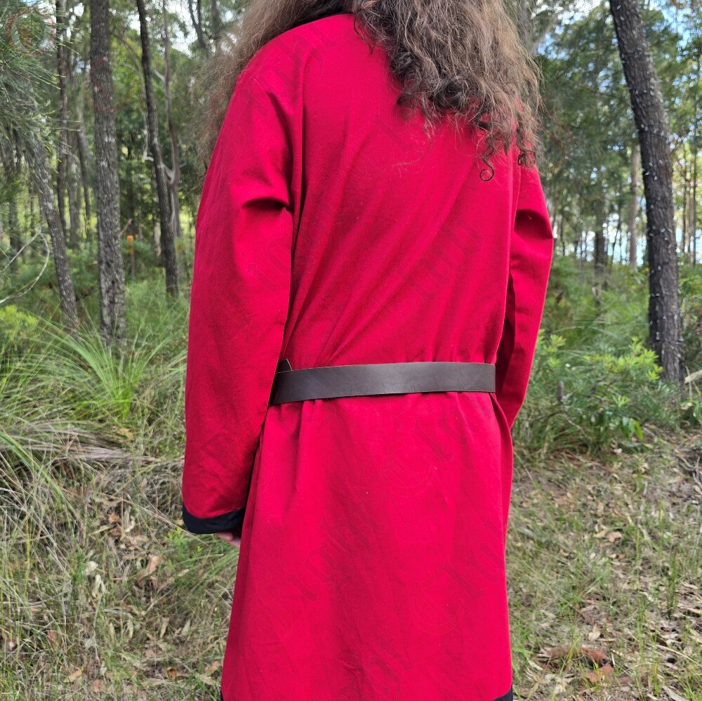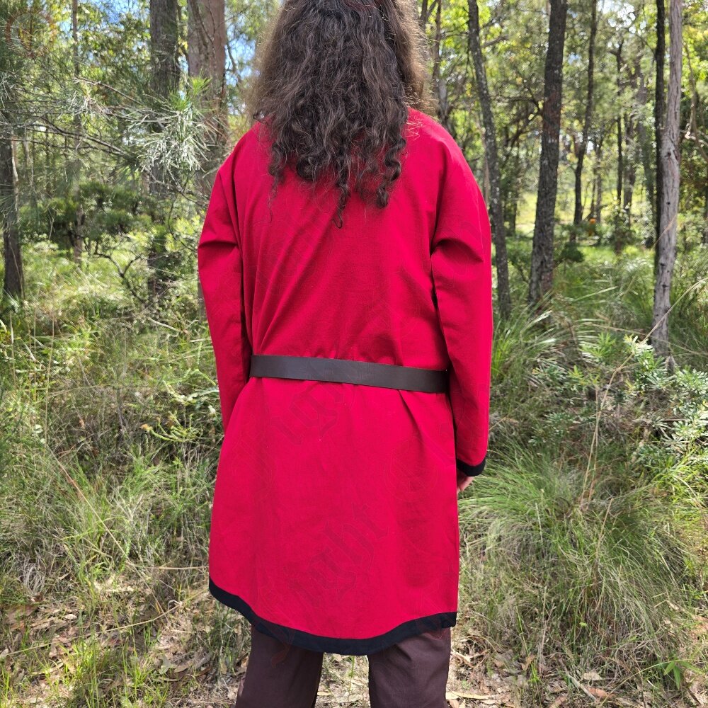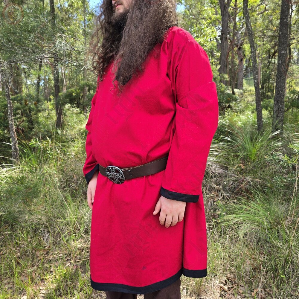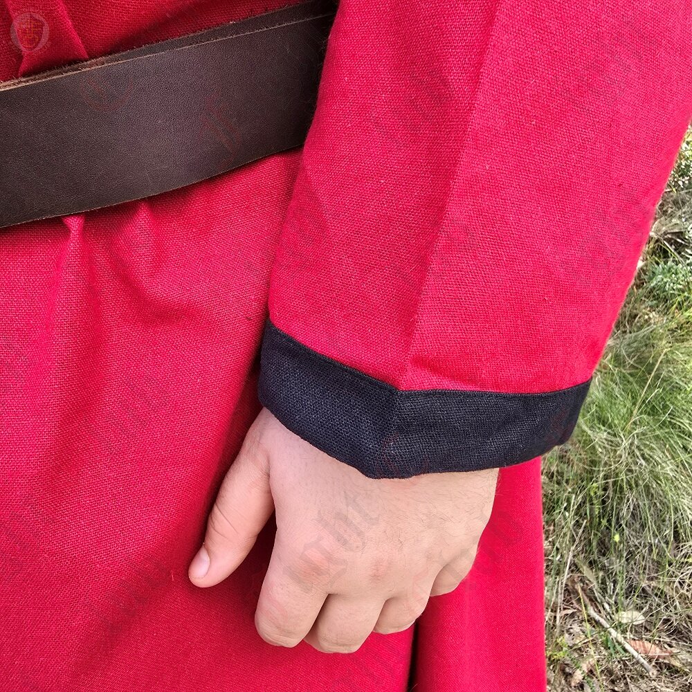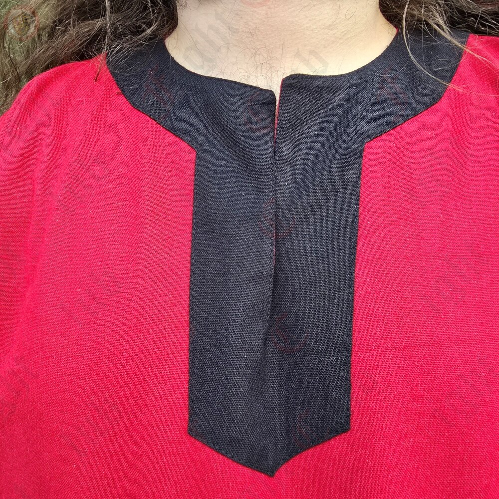 This tunic in particular is 100% cotton, dyed red, and is a standard, simple design with full length sleeves and a v-collar neck. It suits many time periods. Perfect for a standalone tunic, or as an undergarment for cold weather. (or if you want to be stylish and two-toned, ooh get you).